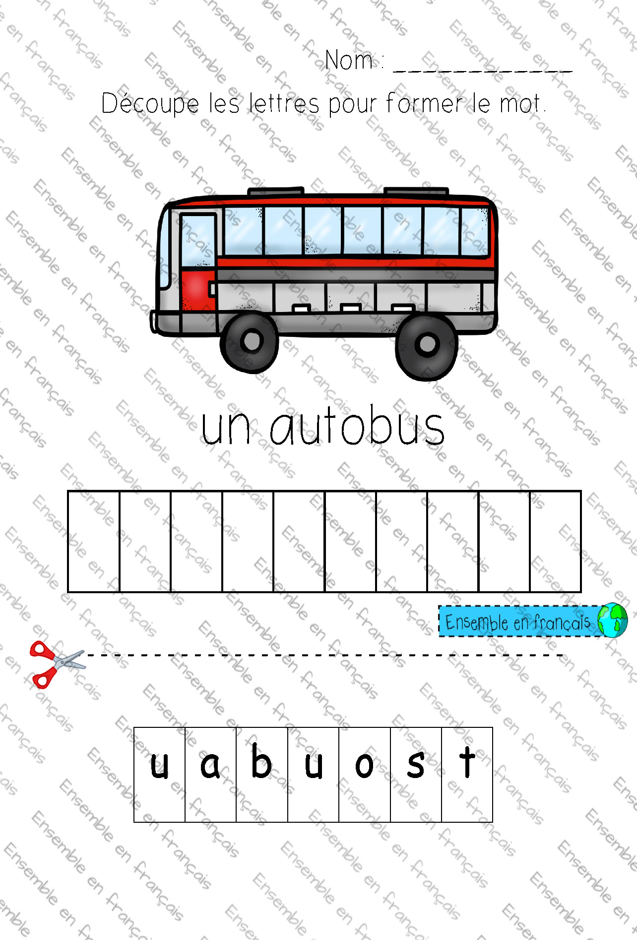 Galerie Découpe les lettres pour former le mot autobus 29. Les transports, Débutant Découpe les lettres pour former le mot autobus Télécharger ensembleenfrancais-admin 2019-10-30T14:53:44-04:00 29. Les transports, Débutant|