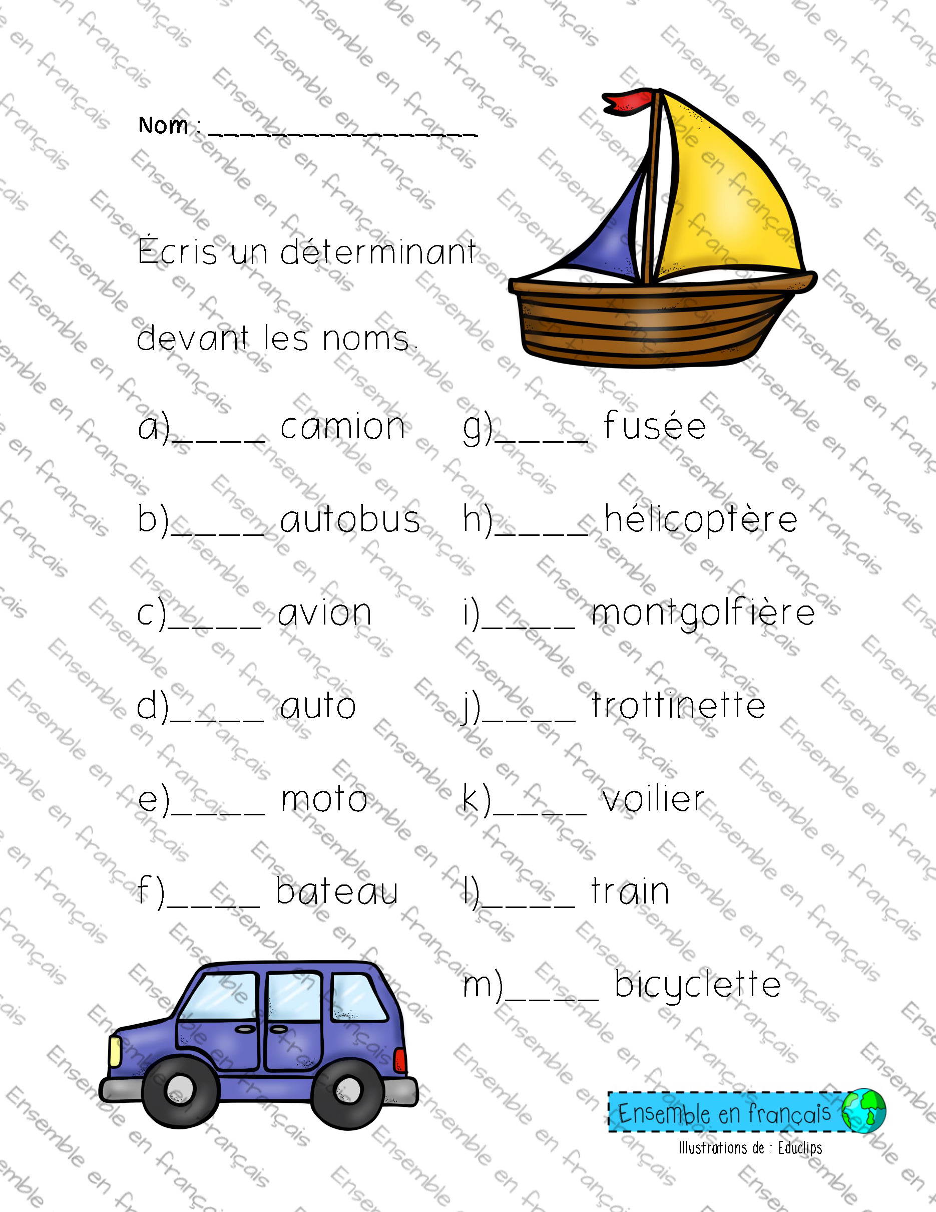 Galerie Écris un déterminant devant les noms 29. Les transports, Débutant Écris un déterminant devant les noms Télécharger ensembleenfrancais-admin 2019-10-31T14:29:00-04:00 29. Les transports, Débutant|