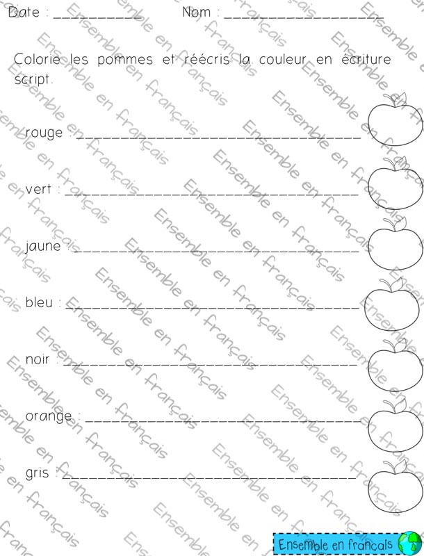 Galerie Colorie les pommes et réécris la couleur en écriture script 00. Les couleurs, Débutant Colorie les pommes et réécris la couleur en écriture script Télécharger ensembleenfrancais-admin 2019-08-07T11:12:55-05:00 00. Les couleurs, Débutant|