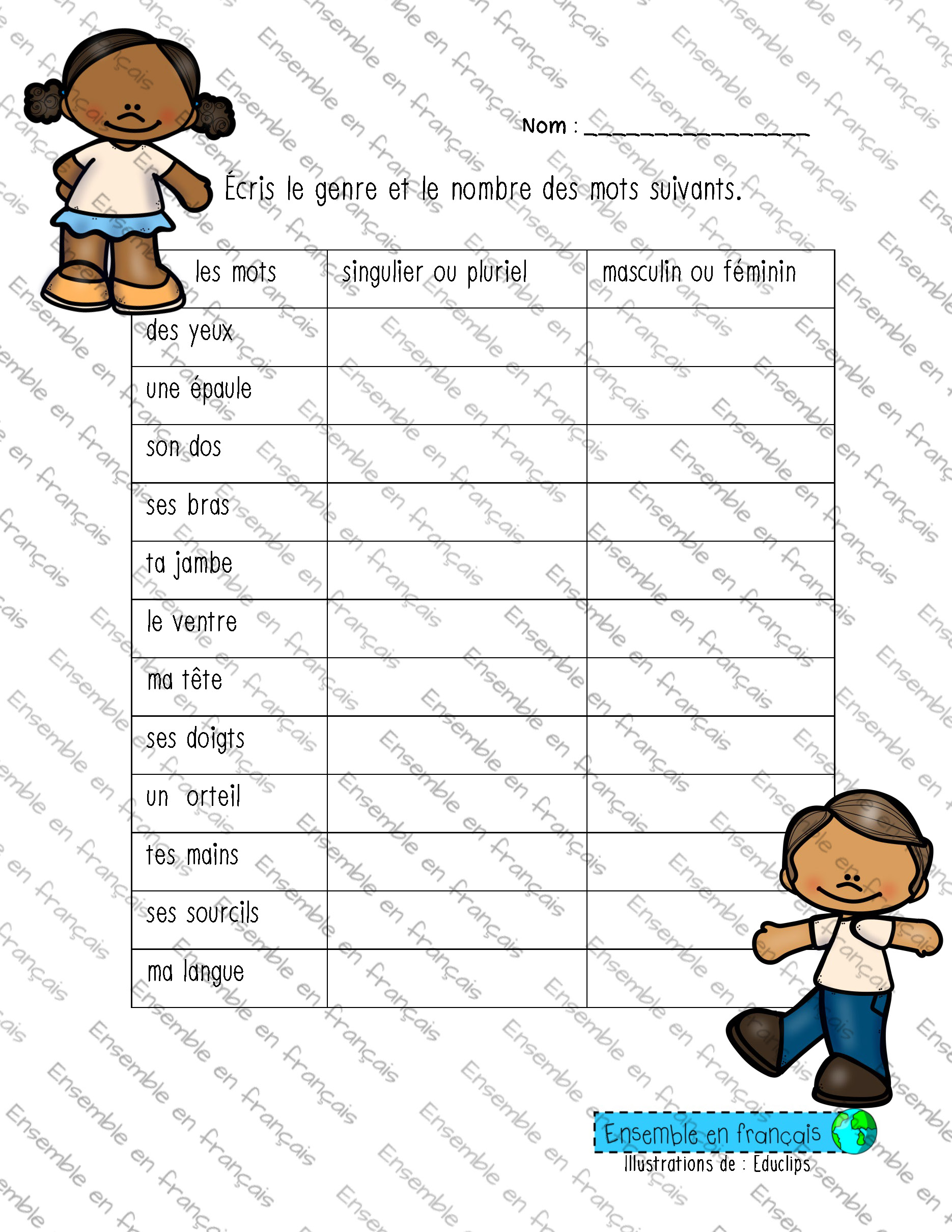 Galerie Écris le genre et le nombre des mots suivants 10. Corps humain, Avancé Écris le genre et le nombre des mots suivants Télécharger ensembleenfrancais-admin 2019-09-16T09:57:43-05:00 10. Corps humain, Avancé|