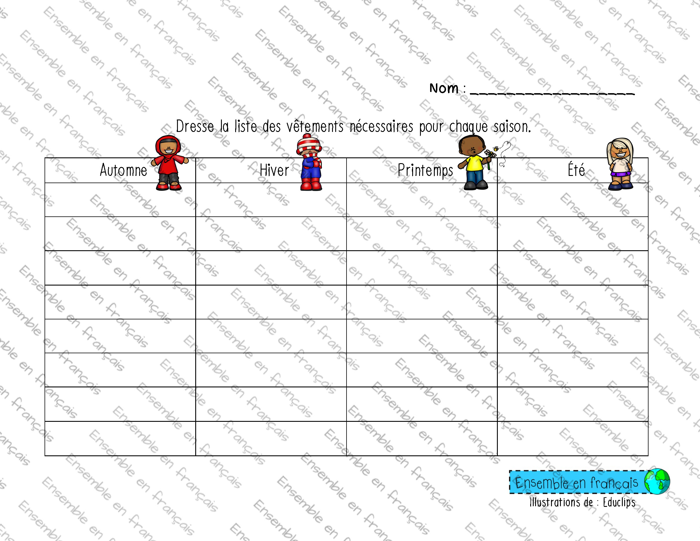 Galerie Dresse la liste des vêtements nécessaires pour chaque saison 11. Vêtements, Intermédiaire Dresse la liste des vêtements nécessaires pour chaque saison Télécharger ensembleenfrancais-admin 2019-09-09T10:30:01-05:00 11. Vêtements, Intermédiaire|