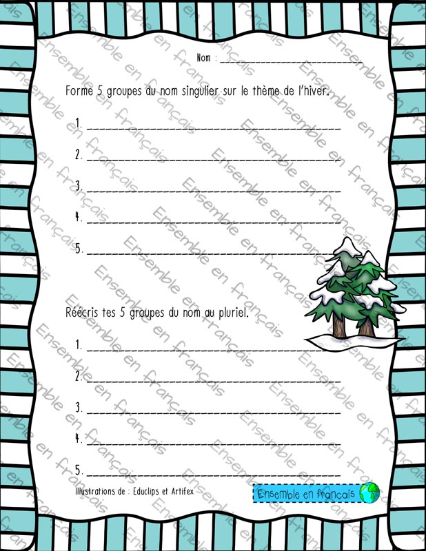 Galerie Forme 5 groupes du nom singulier sur le thème de l’hiver 12. Hiver, Intermédiaire Forme 5 groupes du nom singulier sur le thème de l’hiver Télécharger ensembleenfrancais-admin 2019-07-12T17:03:02-05:00 12. Hiver, Intermédiaire|