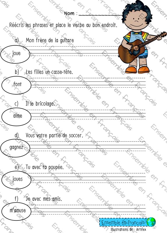 Galerie Réécris les phrases et place le verbe au bon endroit 13. Jouets, Intermédiaire Réécris les phrases et place le verbe au bon endroit Télécharger ensembleenfrancais-admin 2019-07-14T09:54:17-05:00 13. Jouets, Intermédiaire|