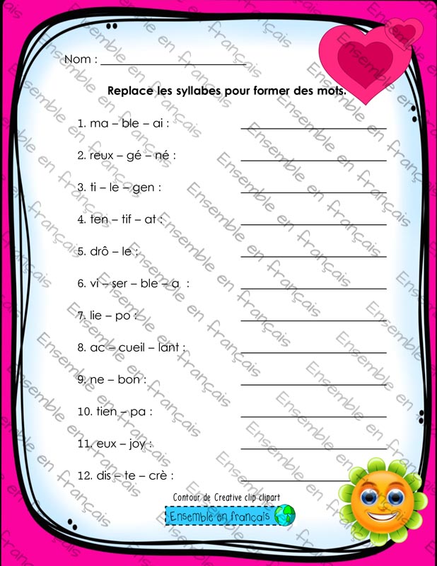 Galerie Replace les syllabes pour former des mots 17. Saint-Valentin, Débutant Replace les syllabes pour former des mots Télécharger ensembleenfrancais-admin 2019-07-18T13:53:16-05:00 17. Saint-Valentin, Débutant|
