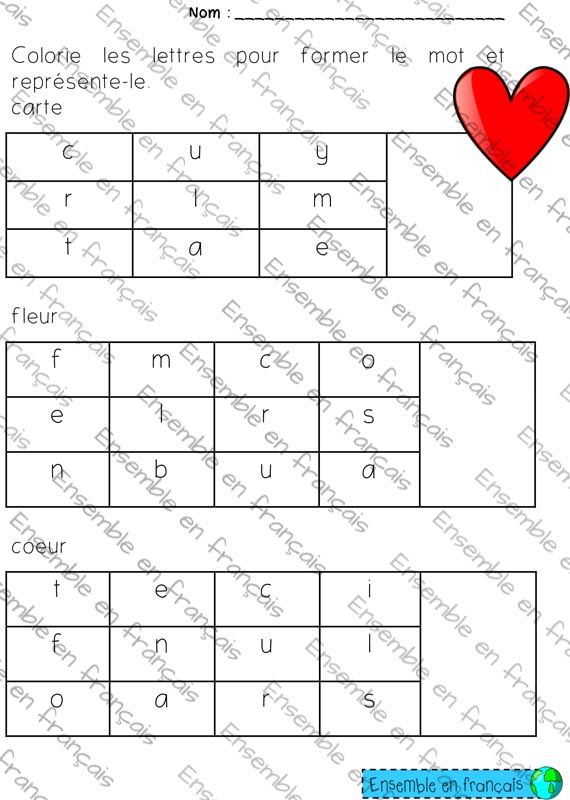 Galerie Colorie les lettres pour former le mot 17. Saint-Valentin, Débutant Colorie les lettres pour former le mot Télécharger ensembleenfrancais-admin 2019-07-15T10:42:11-05:00 17. Saint-Valentin, Débutant|