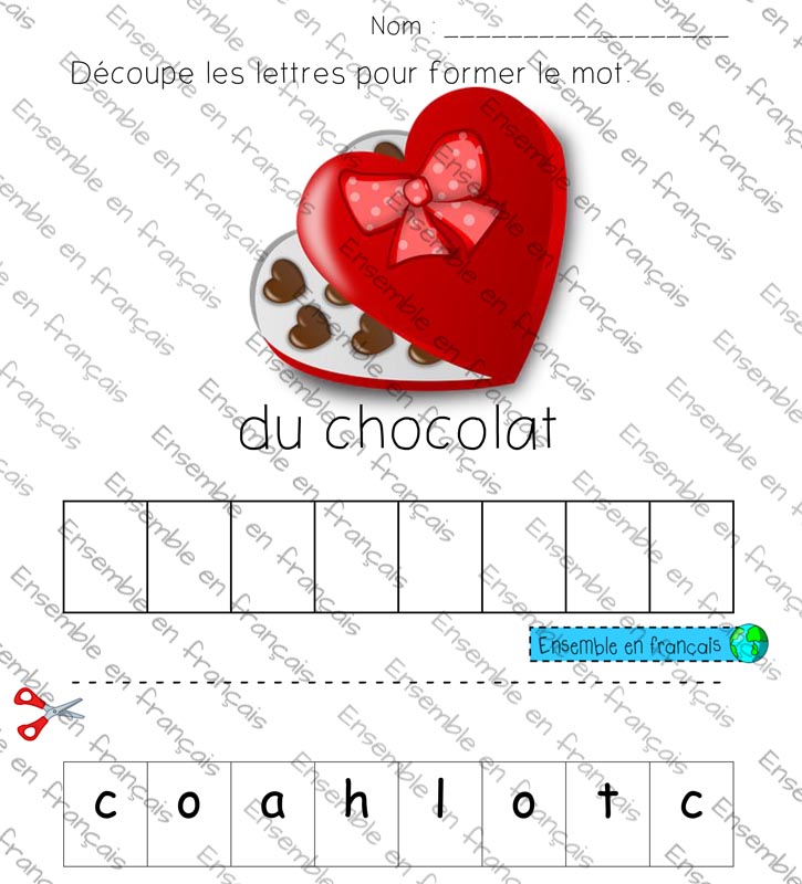 Galerie Découpe les lettres pour former le mot – Chocolat 17. Saint-Valentin, Débutant Découpe les lettres pour former le mot – Chocolat Télécharger ensembleenfrancais-admin 2019-07-15T10:45:32-05:00 17. Saint-Valentin, Débutant|
