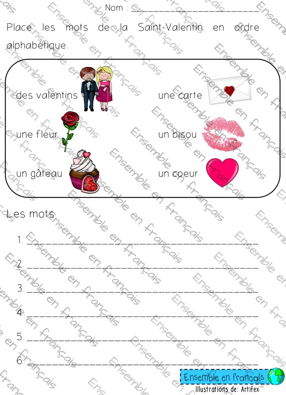 Galerie Place les mots en ordre alphabétique – St-Valentin déb 17. Saint-Valentin, Débutant Place les mots en ordre alphabétique – St-Valentin déb Télécharger ensembleenfrancais-admin 2019-07-15T10:52:38-05:00 17. Saint-Valentin, Débutant|