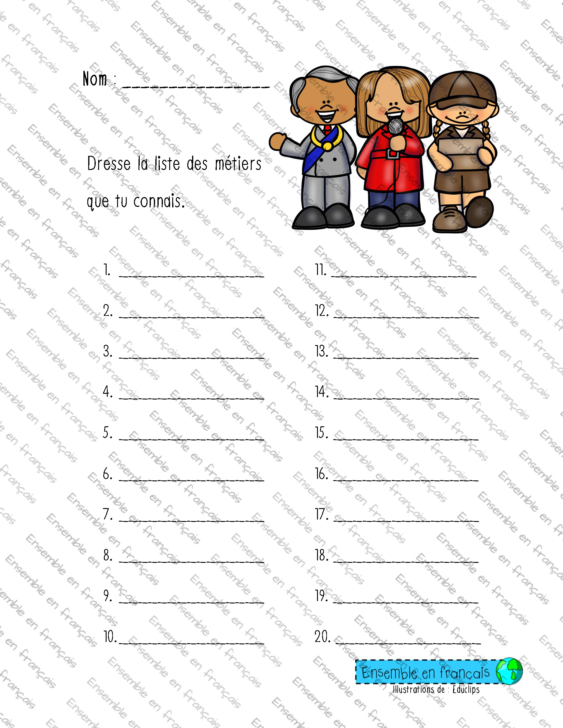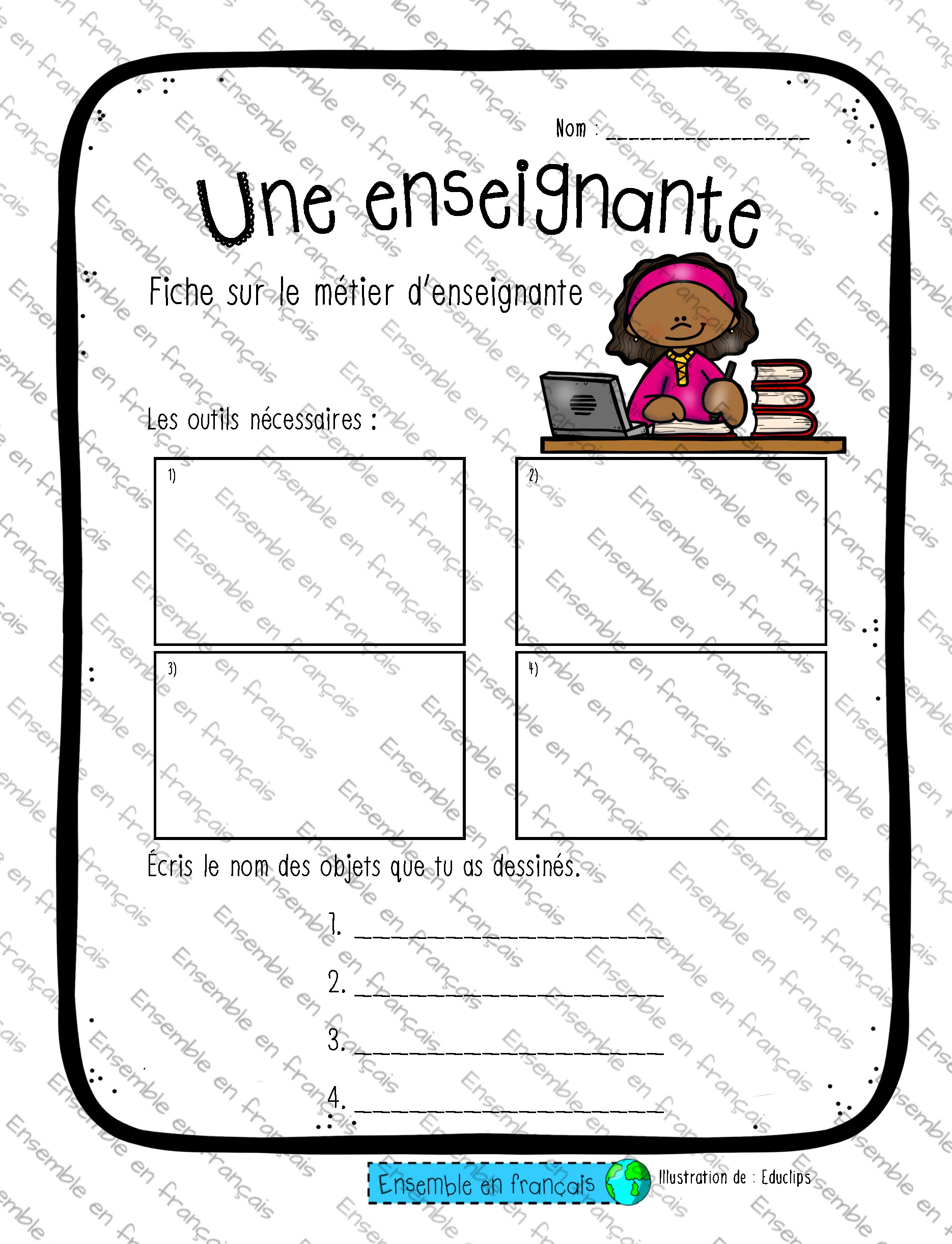Galerie Fiche sur le métier d’enseignante – Déb 18. Métiers, Débutant Fiche sur le métier d’enseignante – Déb Télécharger ensembleenfrancais-admin 2019-07-15T14:14:52-05:00 18. Métiers, Débutant|