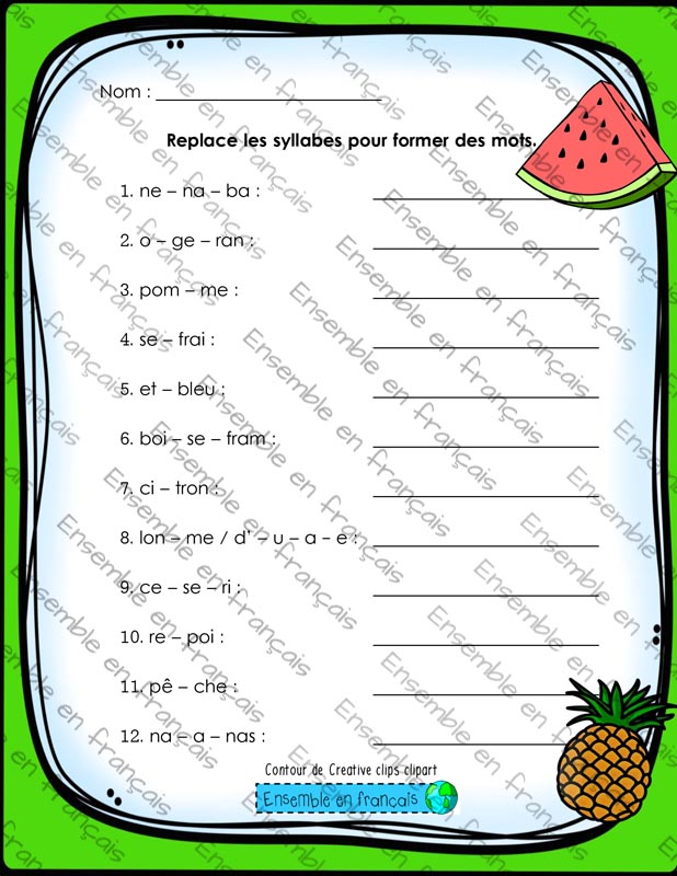 Galerie Replace les syllabes pour former des mots – fruits 19. Alimentation, Débutant Replace les syllabes pour former des mots – fruits Télécharger ensembleenfrancais-admin 2019-07-15T19:29:16-05:00 19. Alimentation, Débutant|