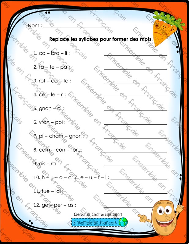 Galerie Replace les syllabes pour former des mots – légumes 19. Alimentation, Débutant Replace les syllabes pour former des mots – légumes Télécharger ensembleenfrancais-admin 2019-07-15T19:30:51-05:00 19. Alimentation, Débutant|