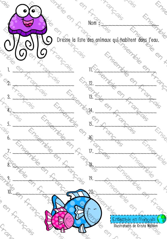 Galerie Dresse la liste des animaux qui habitent dans l’eau 22. Animaux, Avancé Dresse la liste des animaux qui habitent dans l’eau Télécharger ensembleenfrancais-admin 2019-07-16T13:43:12-05:00 22. Animaux, Avancé|