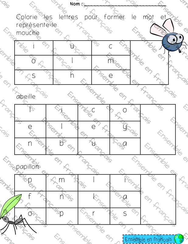 Galerie Colorie les lettres pour former le mot 23. Insectes, Débutant Colorie les lettres pour former le mot Télécharger ensembleenfrancais-admin 2019-07-16T16:18:14-05:00 23. Insectes, Débutant|