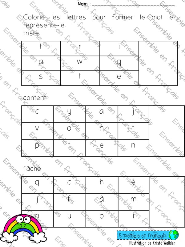 Galerie Colorie les lettres pour former le mot 24. Émotions, Débutant Colorie les lettres pour former le mot Télécharger ensembleenfrancais-admin 2019-07-16T18:04:44-05:00 24. Émotions, Débutant|