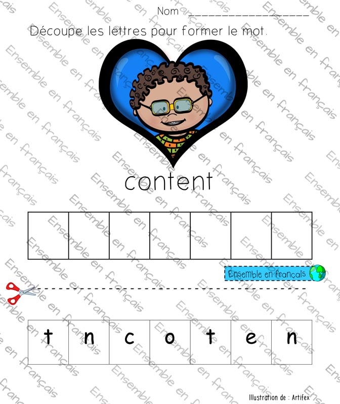 Galerie Découpe les lettres pour former le mot – content 24. Émotions, Débutant Découpe les lettres pour former le mot – content Télécharger ensembleenfrancais-admin 2019-07-16T19:04:05-05:00 24. Émotions, Débutant|
