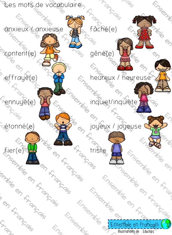 Galerie Liste de mots de vocabulaire – Émotions 24. Émotions, Intermédiaire Liste de mots de vocabulaire – Émotions Télécharger ensembleenfrancais-admin 2019-07-19T10:52:59-05:00 24. Émotions, Intermédiaire|