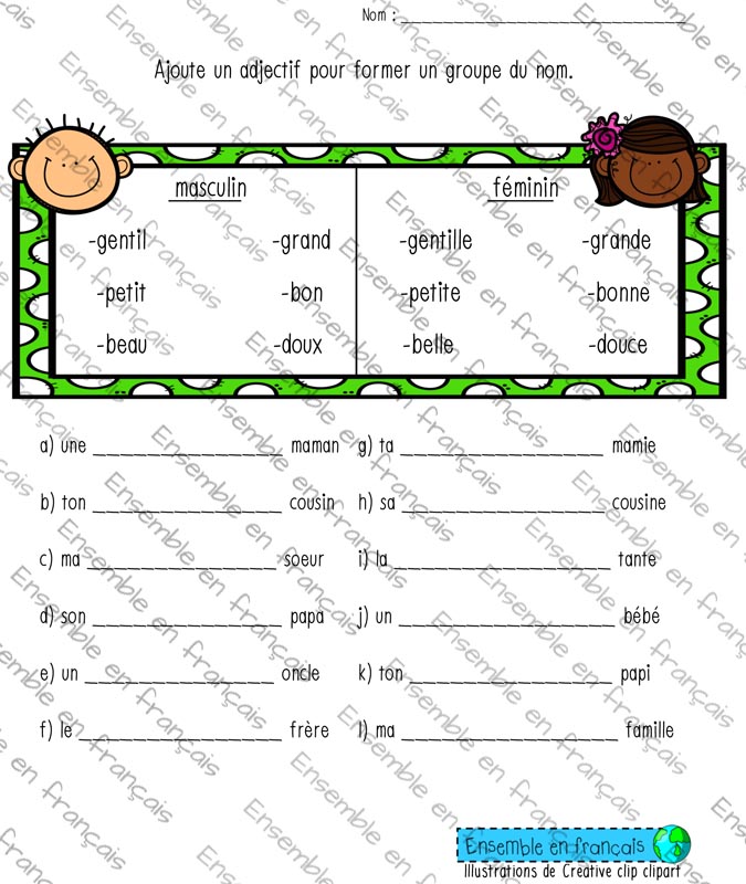 Galerie Ajoute un adjectif pour former un groupe du nom 05. La famille, Avancé Ajoute un adjectif pour former un groupe du nom Télécharger ensembleenfrancais-admin 2019-07-09T18:26:23-05:00 05. La famille, Avancé|