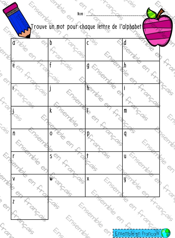 Galerie Trouve un mot pour chaque lettre de l’alphabet Alphabet, Intermédiaire Trouve un mot pour chaque lettre de l’alphabet Télécharger ensembleenfrancais-admin 2019-07-19T11:11:43-04:00 Alphabet, Intermédiaire|